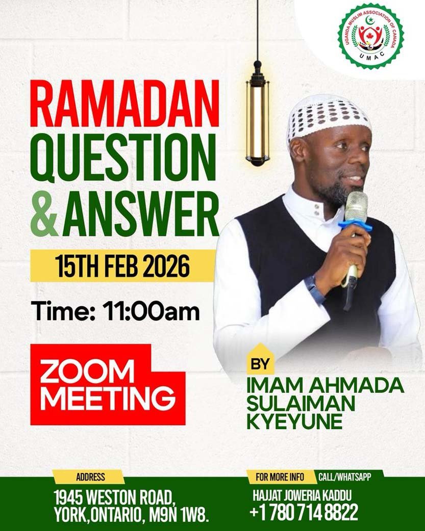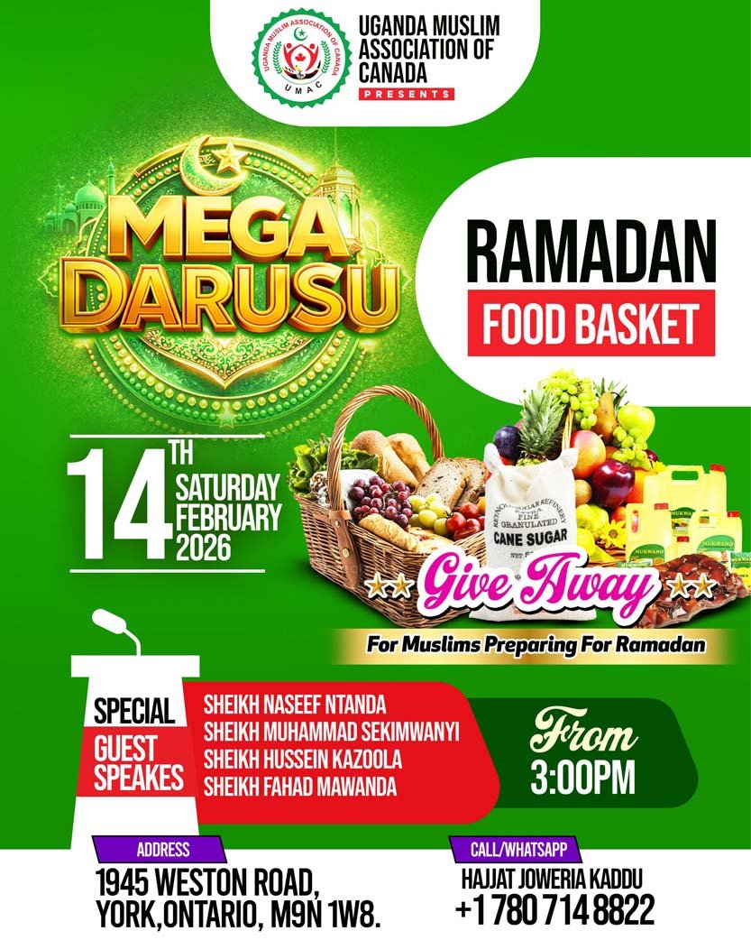 The UMAC-Community Center Food Bank and All Nations Settlement Center (ANSC) are pleased to present to you the "Ramadan Food Basket" SPECIAL GUEST SPEAKERS: Sheikh Naseef Ntanda Sheikh Muhammad Sekimwanyi Sheikh Hussein Kazoola Sheikh Fahad Mawanda